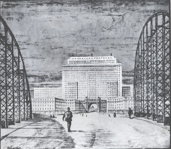 Otho Orlando Kurz: Vorschlag für ein Hochhaus an der Hackerbrücke in München. (Wasmuths Monatshefte für Baukunst 6 [1921/22], 92)