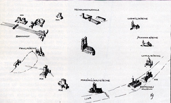 Hochhauspläne von Herman Sörgel. Hochhäuser sollen zusammen mit bestehenden Kirchen und anderen dominanten Bauwerken einen Ring um die Münchner Altstadt bilden. (aus: Baukunst, 1 [1925], 59)