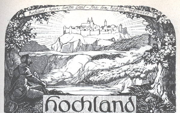 Titelbild der Zeitschrift "Hochland" mit Motto, Illustrationen von Hermann Bek-Gran (1869-1909). Abb. aus: Hochland 1 (1903/04), 1. Bd., 1. (Bayerische Staatsbibliothek, Per. 62 nk-1,1)