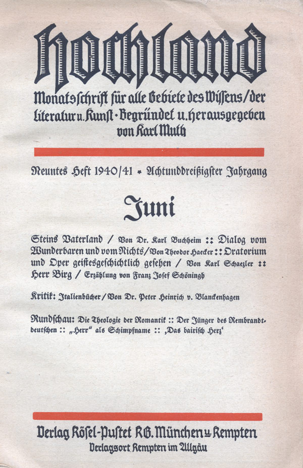 Titelblatt der letzten Ausgabe des "Hochland" vor dem Verbot 1941.