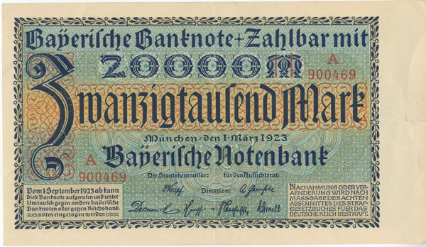 Banknote der Bayerischen Notenbank (München) über 20.000 Mark, März 1923. (HVB Stiftung Geldscheinsammlung)