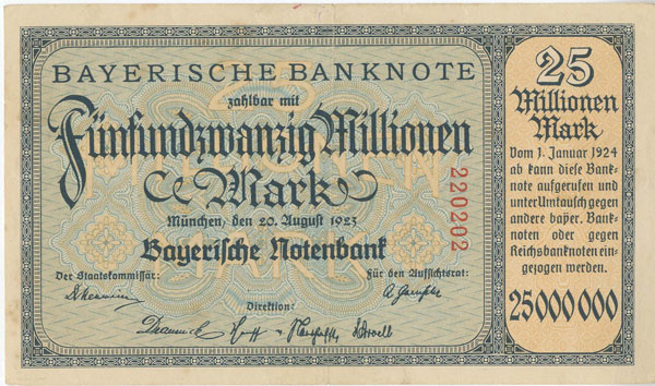 25 Millionen Mark der Bayerischen Notenbank (München), August 1923. (HVB Stiftung Geldscheinsammlung)