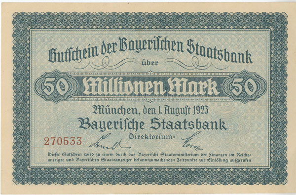 50-Millionen-Mark-Schein der Bayerischen Staatsbank (München), August 1923. (HVB Stiftung Geldscheinsammlung)