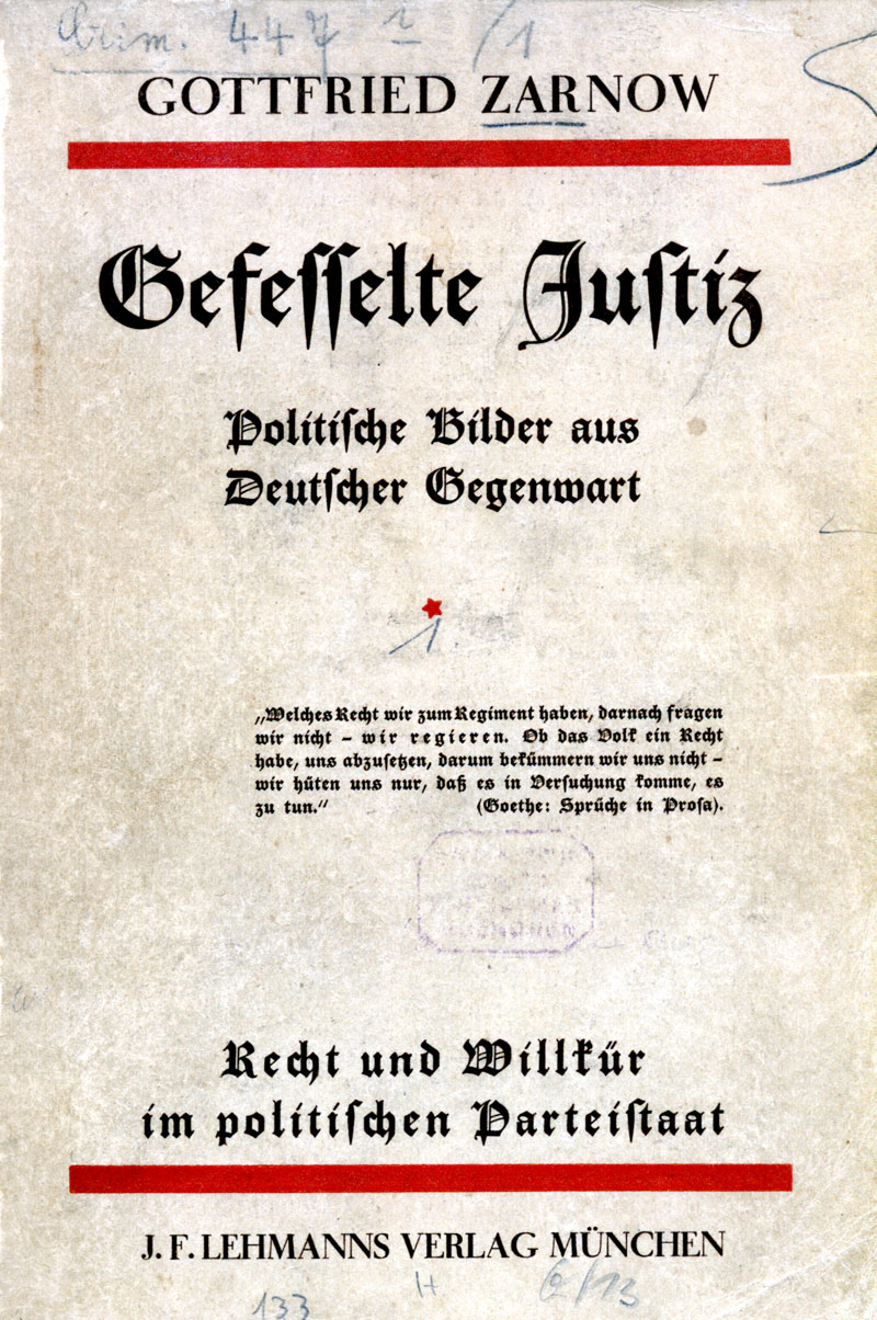 Gottfried Zarnow, Gefesselte Justiz, Deckblatt der Erstausgabe 1930, erschienen im J F Lehmanns Verlag, München1930