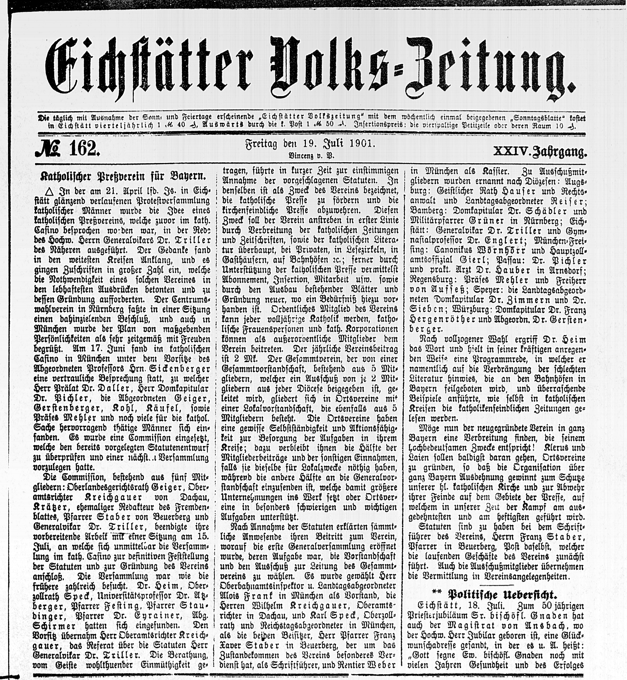 Bericht der Eichstätter Volkszeitung vom 19. Juli 1901 über die Gründung des Katholischen Preßvereins für Bayern. (Universitätsbibliothek Eichstätt-Ingolstadt, 222/AZ 95976-1901)