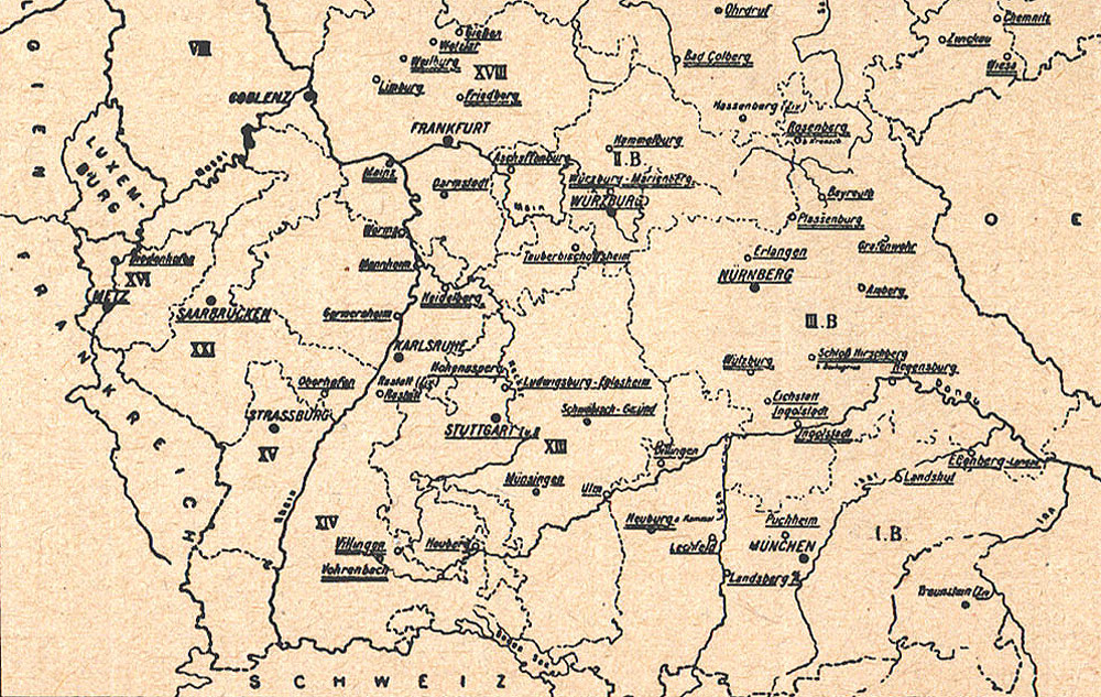 Karte der Kriegsgefangenenlager in Bayern und der Pfalz. (Ausschnitt aus: Wilhelm Doegen, Kriegsgefangene Völker. Band 1: Der Kriegsgefangenen Haltung und Schicksal in Deutschland, Berlin 1919, Abb. D)