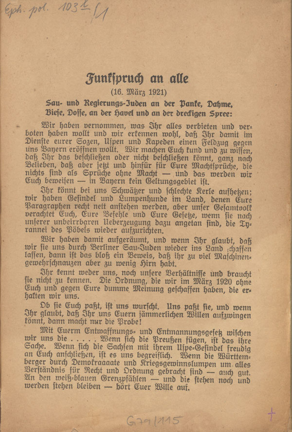 Auszug aus einem antisemitischen Hetzartikel, in dem Ludwig Thoma die Berliner Reichsregierung attackiert. (Miesbacher Anzeiger, 21. März 1921; kritisch kommentiert bei Wilhelm Volkert [Bearb.], Ludwig Thoma: Sämtliche Beiträge aus dem "Miesbacher Anzeiger" 1920/21, München 1989, 181-184)