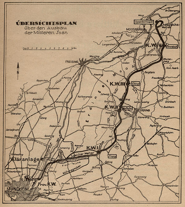 Übersicht über die Kraftwerkstreppe der Mittleren Isar zwischen München und Moosburg. (aus: F. Krieger, Großwasserkraftanlagen Mittlere Isar, München 1923, 2)