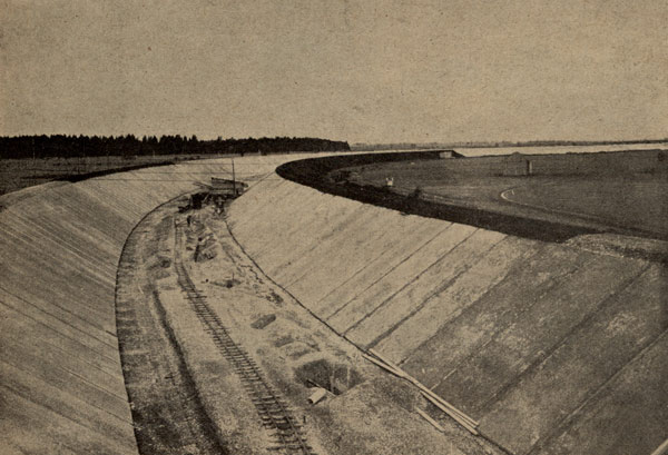 Werkkanalstrecke mit betonierten Böschungen. (aus: F. Krieger, Großwasserkraftanlagen Mittlere Isar, München 1923, 26)
