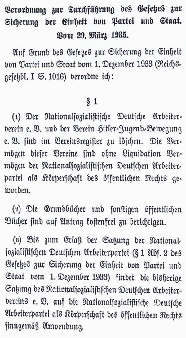 Verordnung zur Durchführung des Gesetzes zur Sicherung der Einheit von Partei und Staat, 29. März 1935. (Reichsgesetzblatt 1935, I, 502)