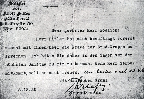 Einladung an die Münchner Studenten Wilhelm Tempel und Helmut Podlich, die Gründung eines NS-Studentenbundes mit Rudolf Heß zu besprechen, 8. Dezember 1925. (aus: Studenten im Kampf. Beiträge zur Geschichte des NSD.-Studentenbundes, München 1938, 10)