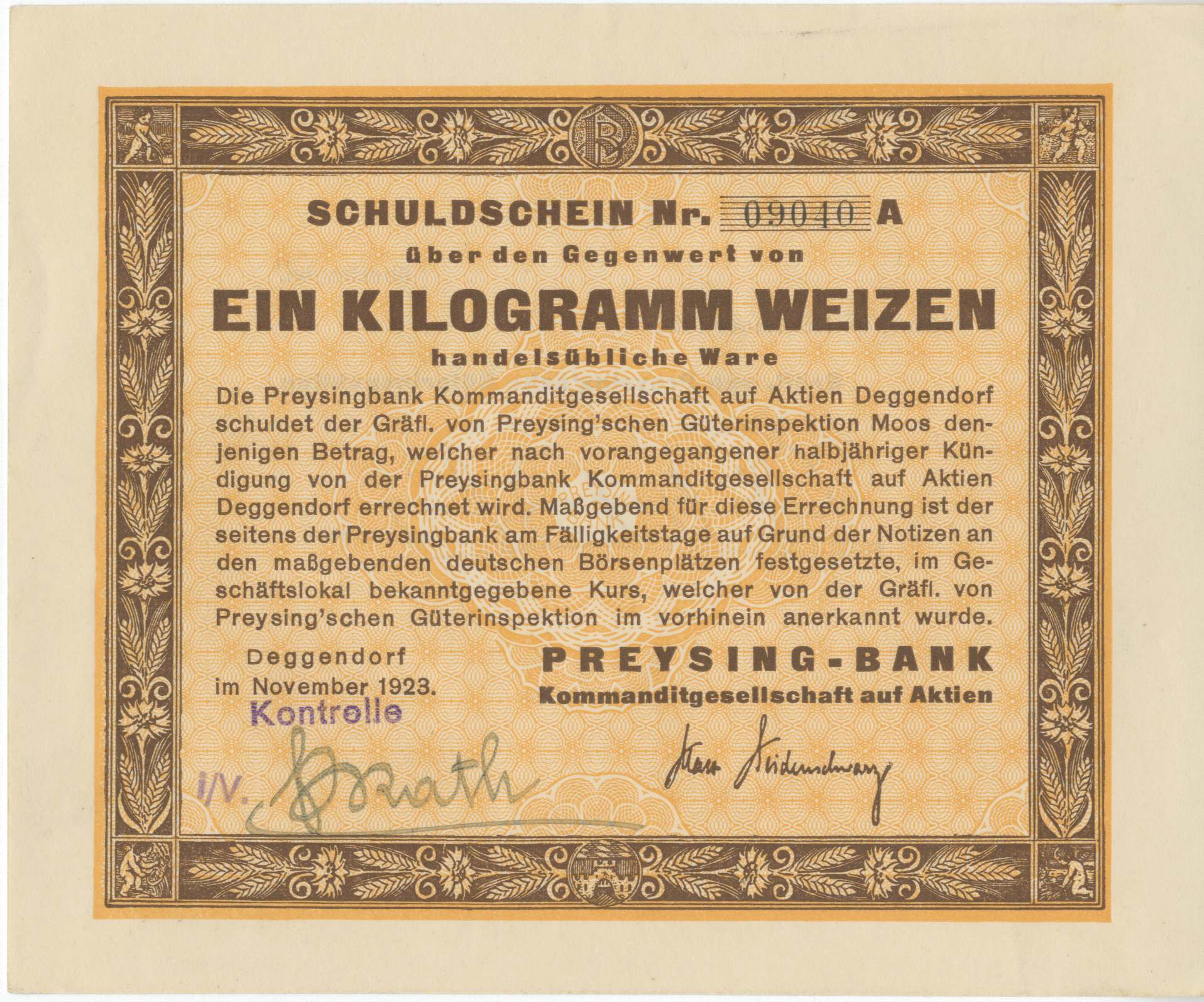Schuldschein über ein Kilogramm Weizen, ausgestellt von der Preysingbank Deggendorf im Jahr 1923. (Ein ähnlicher Schuldschein und weitere Informationen dazu bei bavarikon) (HBV Stiftung Geldscheinsammlung)