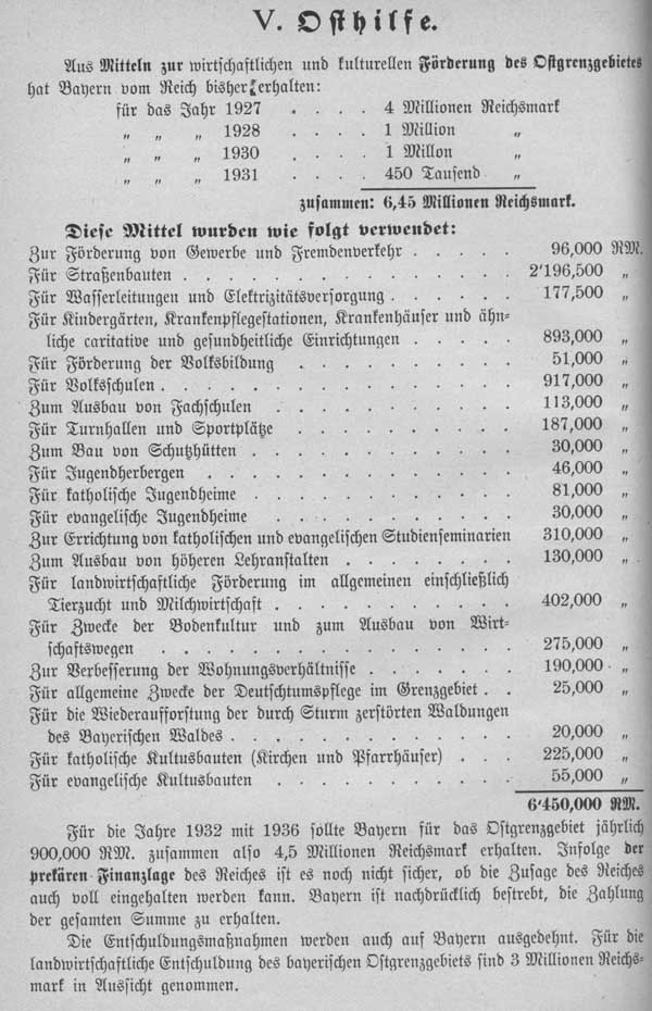 Verwendung von Osthilfe-Mitteln bis 1932. (aus: Bayerische Landtagswahlen 1932. Materialien aus dem Gebiet der Staats- und Wirtschaftspolitik, hg. von der Bayerischen Volkspartei, München 1932, 64)