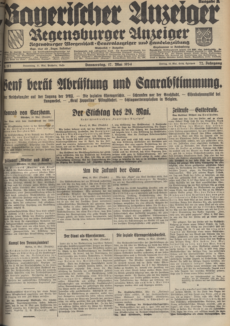Ausgabe vom 17 Mai 1934 mit dem Artikel Zeitrufe - Gottesrufe von Kardinal Faulhaber Dieser Artikel war der Anlass für ein neuerliches, diesmal dreimonatiges Verbot desAnzeigers