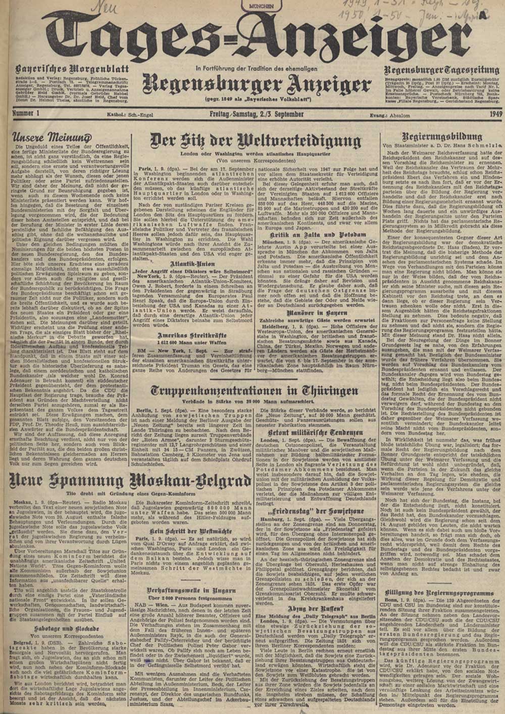 Die erste Ausgabe des nach der Generallizensierung neu erschienenen Tages-Anzeigers vom 2/3 September1949