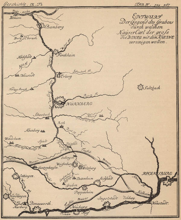Entwurf eines Grabens, der die Donau mit dem Rhein verbinden sollte. (in: Heinrich Brüschwien, Der Gedanke einer Rhein-Main-Donau-Verbindung in seiner geschichtlichen Entwicklung, Regensburg 1928)