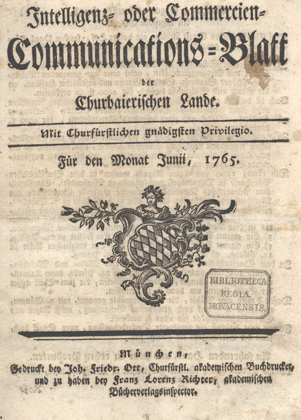 Intelligenz-oder Commercien-Communications-Blatt der Churbaierischen Lande. Mit Churfürstlichen gnädigsten Privilegio. Für den Monat Junii, 1765. (Titelblatt)[