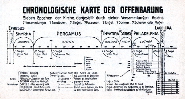 Chronologische Karte der Offenbarung nach Charles Taze Russel [aus: CT Russell, Das Vollendete Geheimnis [Schriftstudien 7], Barmen/Zürich/Brooklyn 1922, S778]