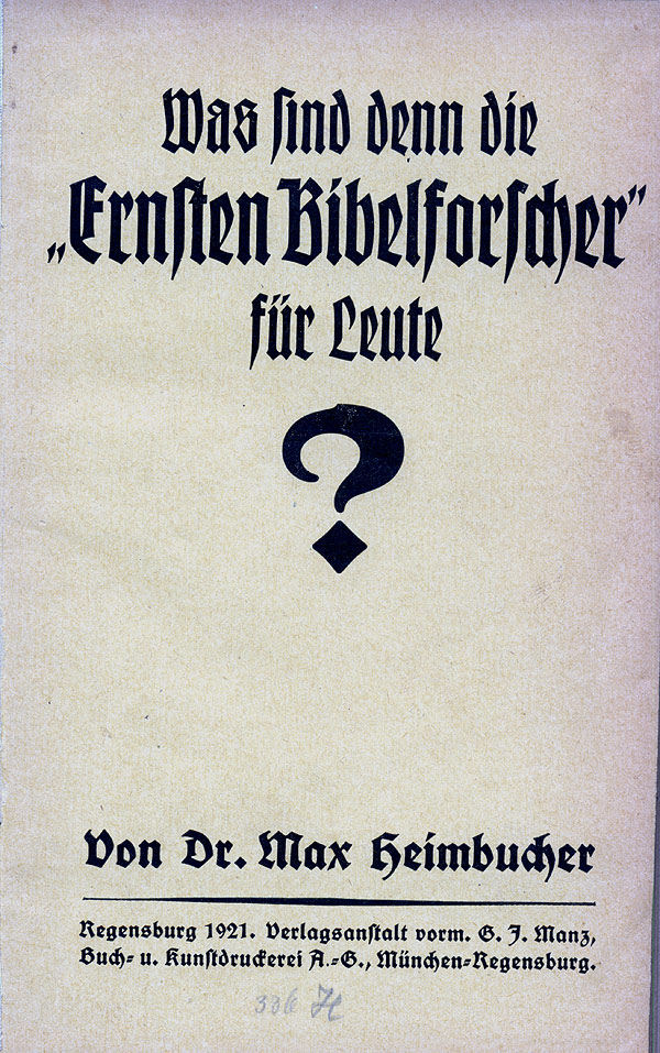 Titelblatt einer katholischen Aufklärungsschrift über die Ernsten Bibelforscher des katholischen Theologen und Kirchenhistorikers Max Heimbucher [1859-1946] von 1921 Es handelt sich nur um eine von zahlreichen katholischen und evangelischen Publikationen, die Anfang der 1920er Jahre diese Thematikbehandelten