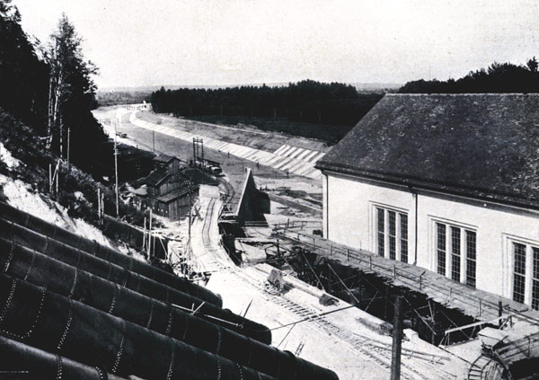 Das Alzwerk im Bau, im Hintergrund der noch nicht geflutete Unterlauf des Alzkanals (sog. Unterwasserkanal). (Alzwerke G.m.b.H. München. Burghausen. Zur Betriebseröffnung des Alzkraftwerkes, o.O., [1923], 22)
