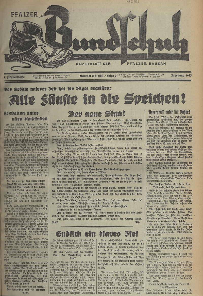 Pfälzer Bundschuh Kampfblatt der Pfälzer Bauern, 1 Februarwoche 1933, 1 Ausgabe nach derMachtergreifung