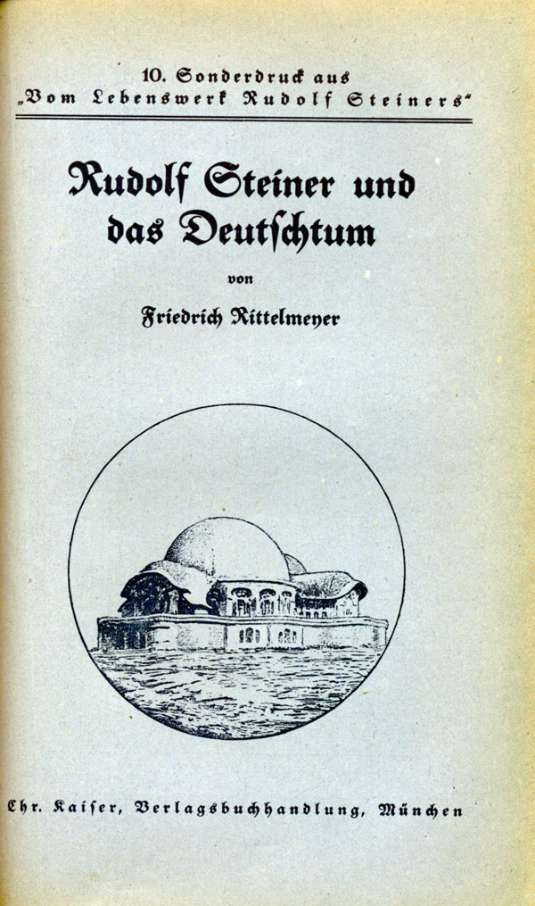 Rudolf Steiner und das Deutschtum Das Titelblatt der bei Christian Kaiser in München verlegten Schrift von Friedrich Rittelmeyer zeigt das von Steiner erbaute ersteGoetheanum