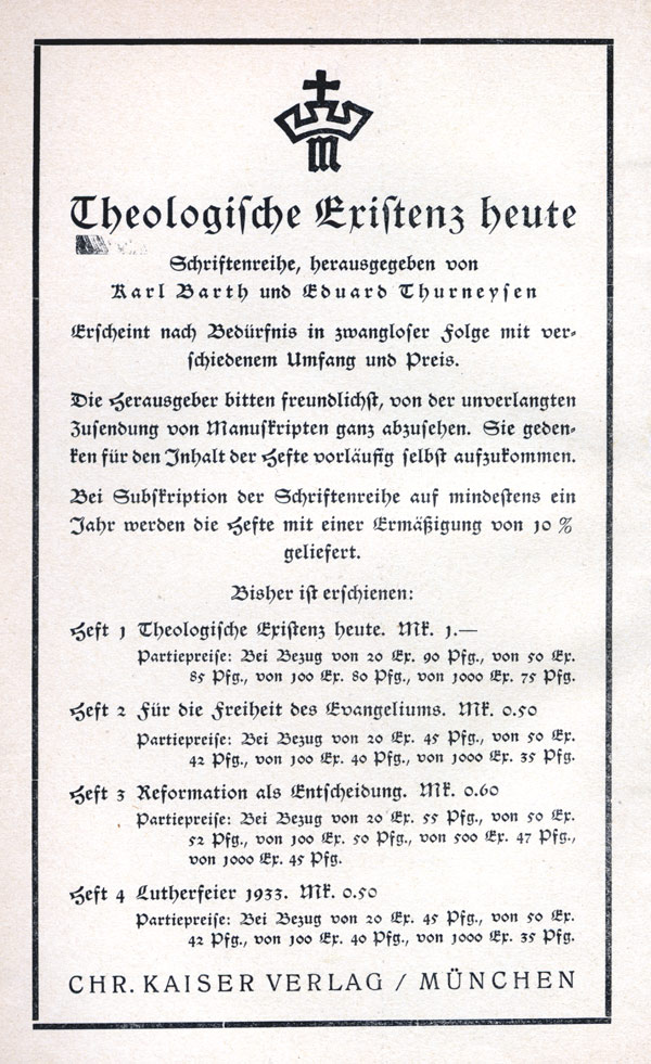 Titelübersicht von Theologische Existenz heute [aus: Barth, Theologische Existenz heute!,1934]