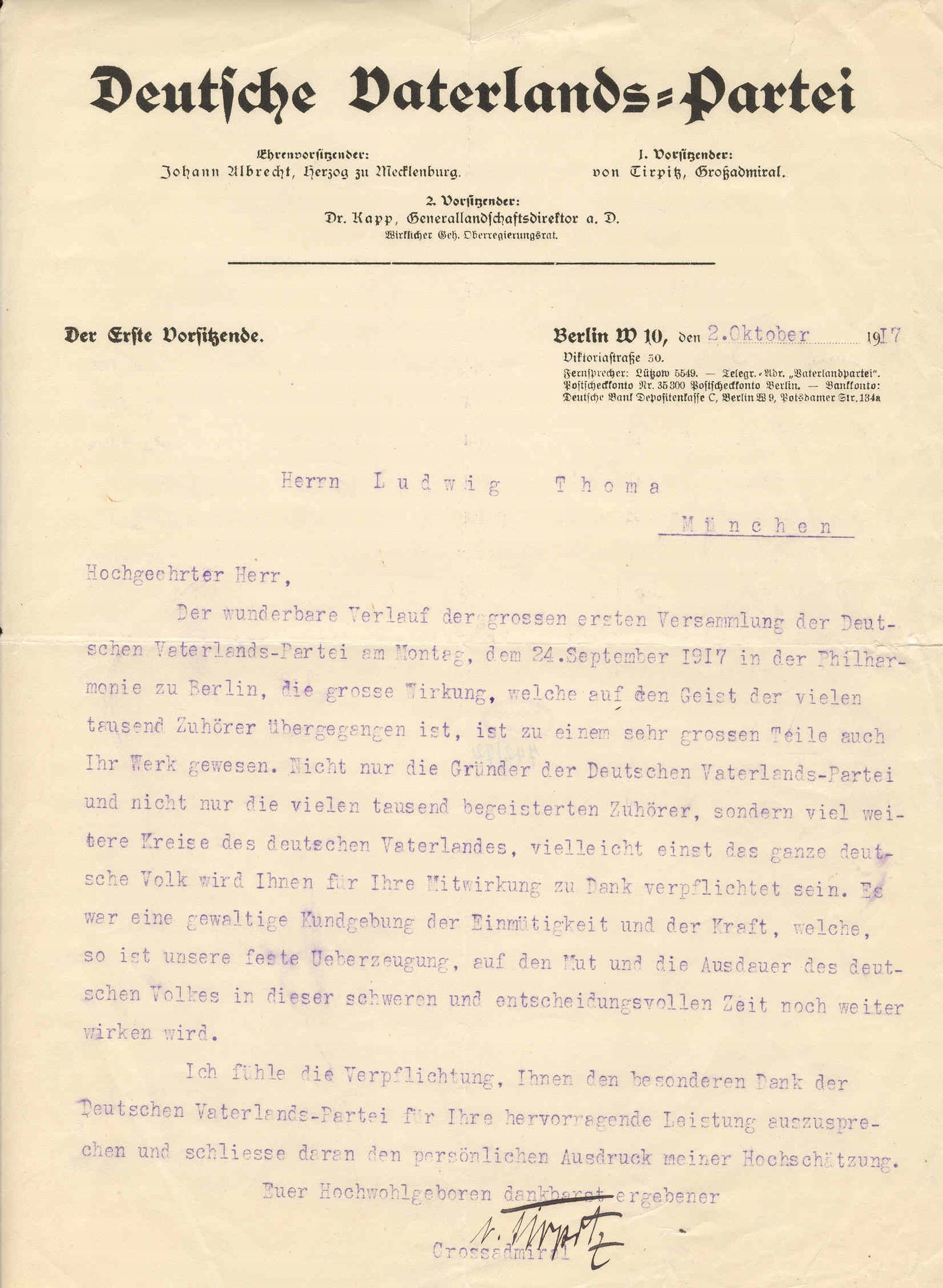 Schreiben Alfred von Tirpitz' (1849-1930) an Ludwig Thoma (1867-1921) vom 2.10.1917. Tirpitz dankt Thoma für dessen Mitwirkung bei der ersten öffentlichen Parteikundgebung der DVLP in der Berliner Philharmonie am 24.9.1917. (Monacensia. Literaturarchiv und Bibliothek, München)