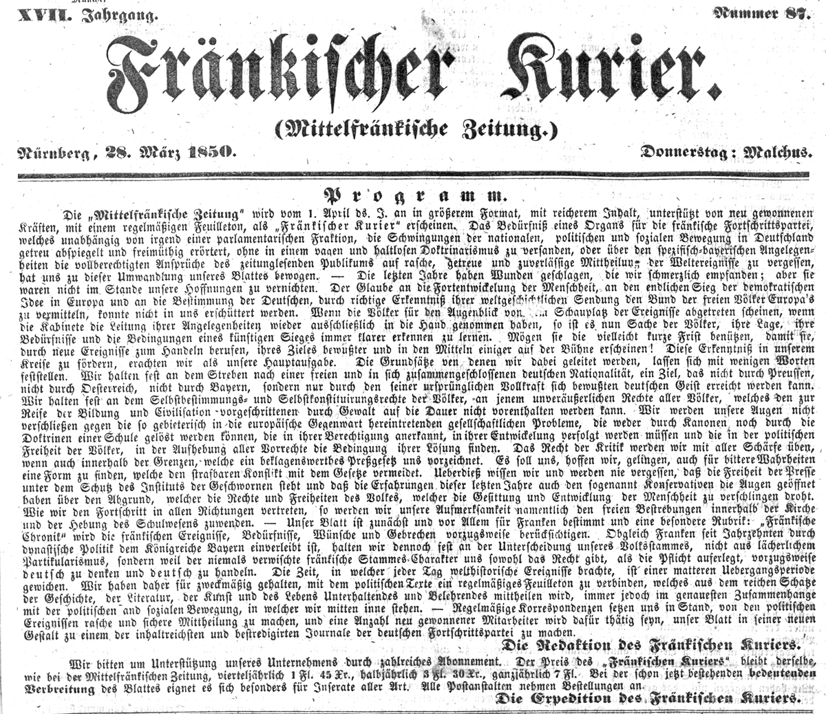Seit dem 28. März 1850 trug der "Fränkische Kurier" diesen Titel. Die ersten Ausgaben stellten das Programm der Zeitung vor. (Bayerische Staatsbibliothek)