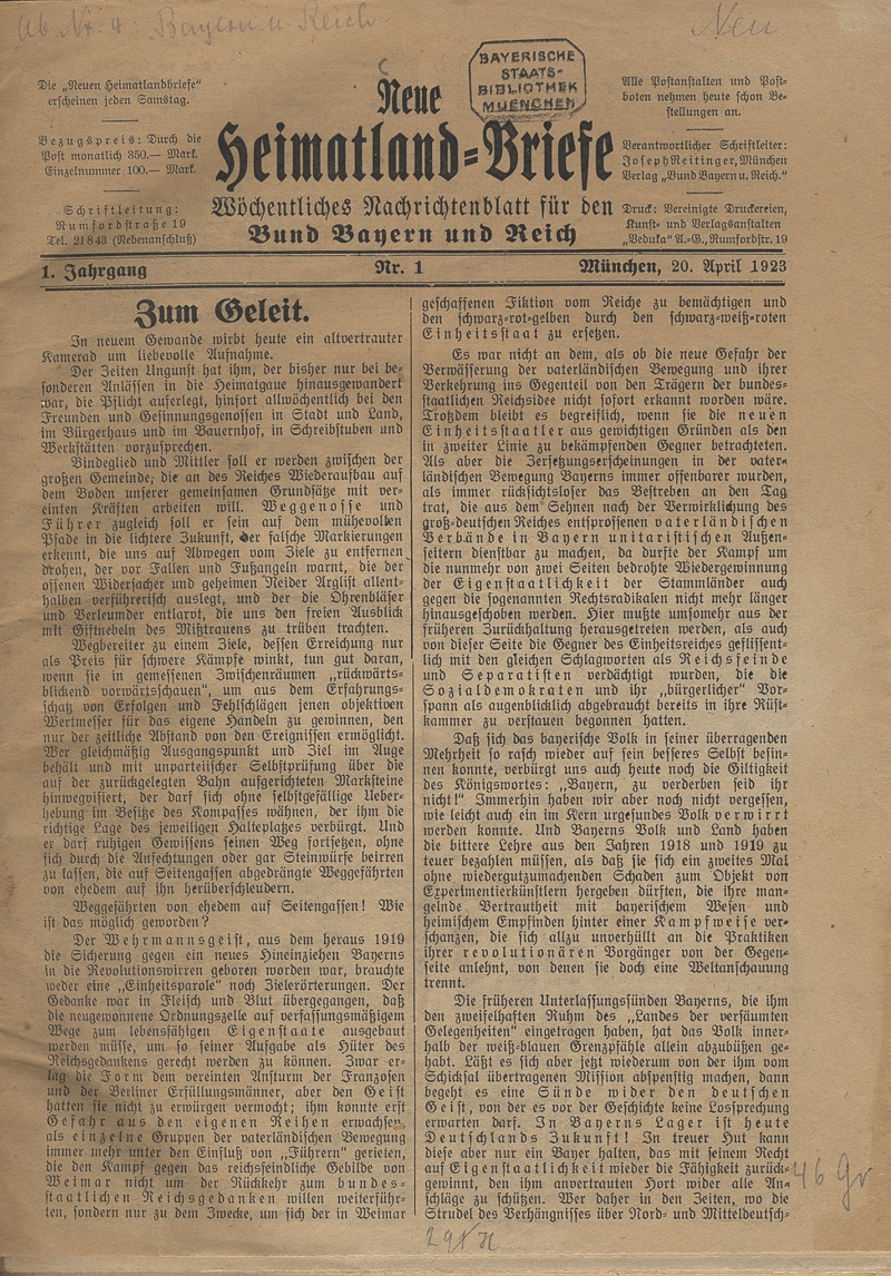 Titelblatt der ersten Ausgabe unter dem Namen Neue Heimatland-Briefe, 20 April1923