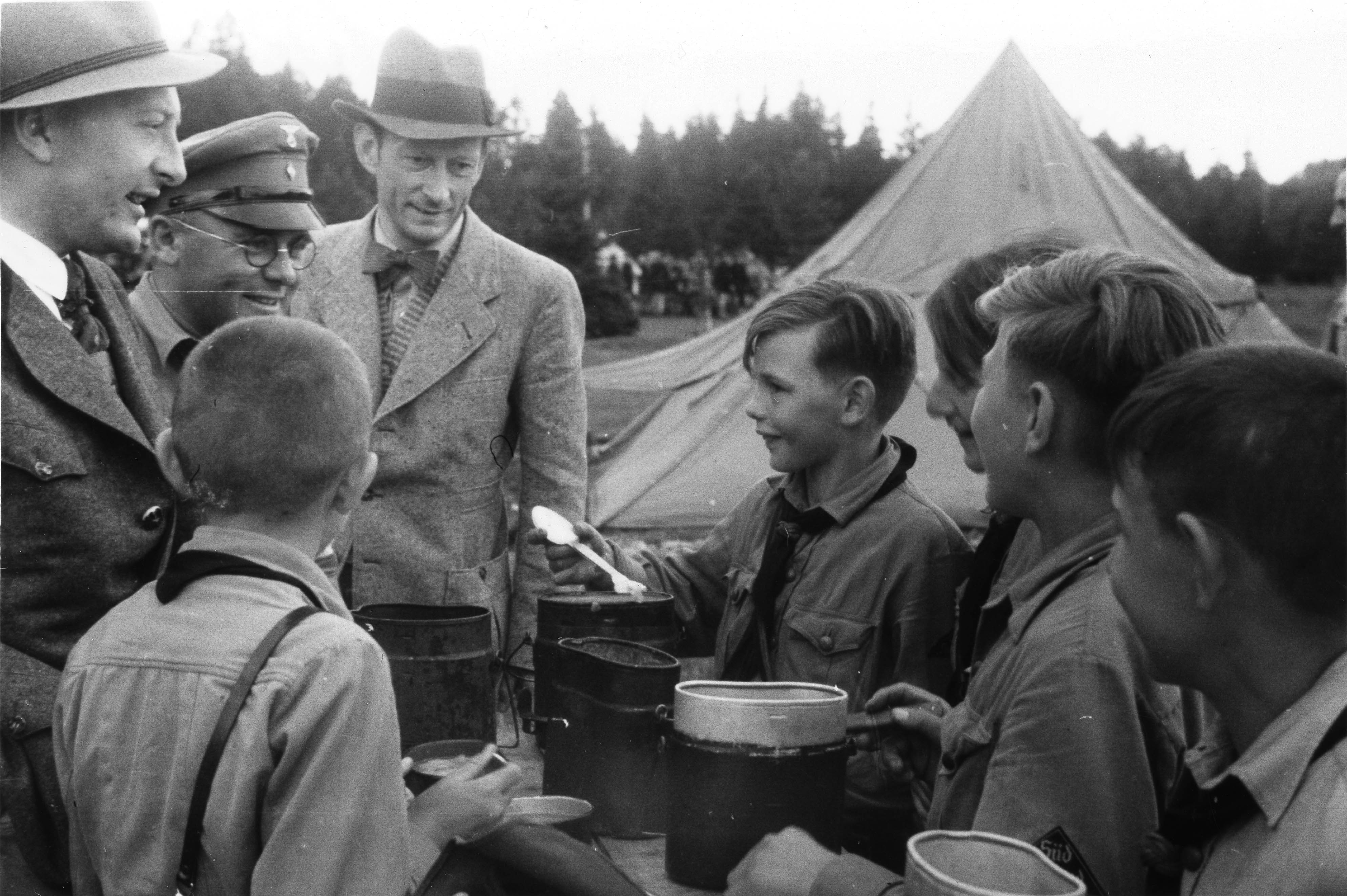 HJ-Hochlandlager in Königsdorf (Lkr. Bad Tölz-Wolfratshausen), Juli und August 1936; 2.v.l. Obergebietsführer Emil Klein (mit Brille). (Bayerische Staatsbibliothek, Fotoarchiv Hoffmann)