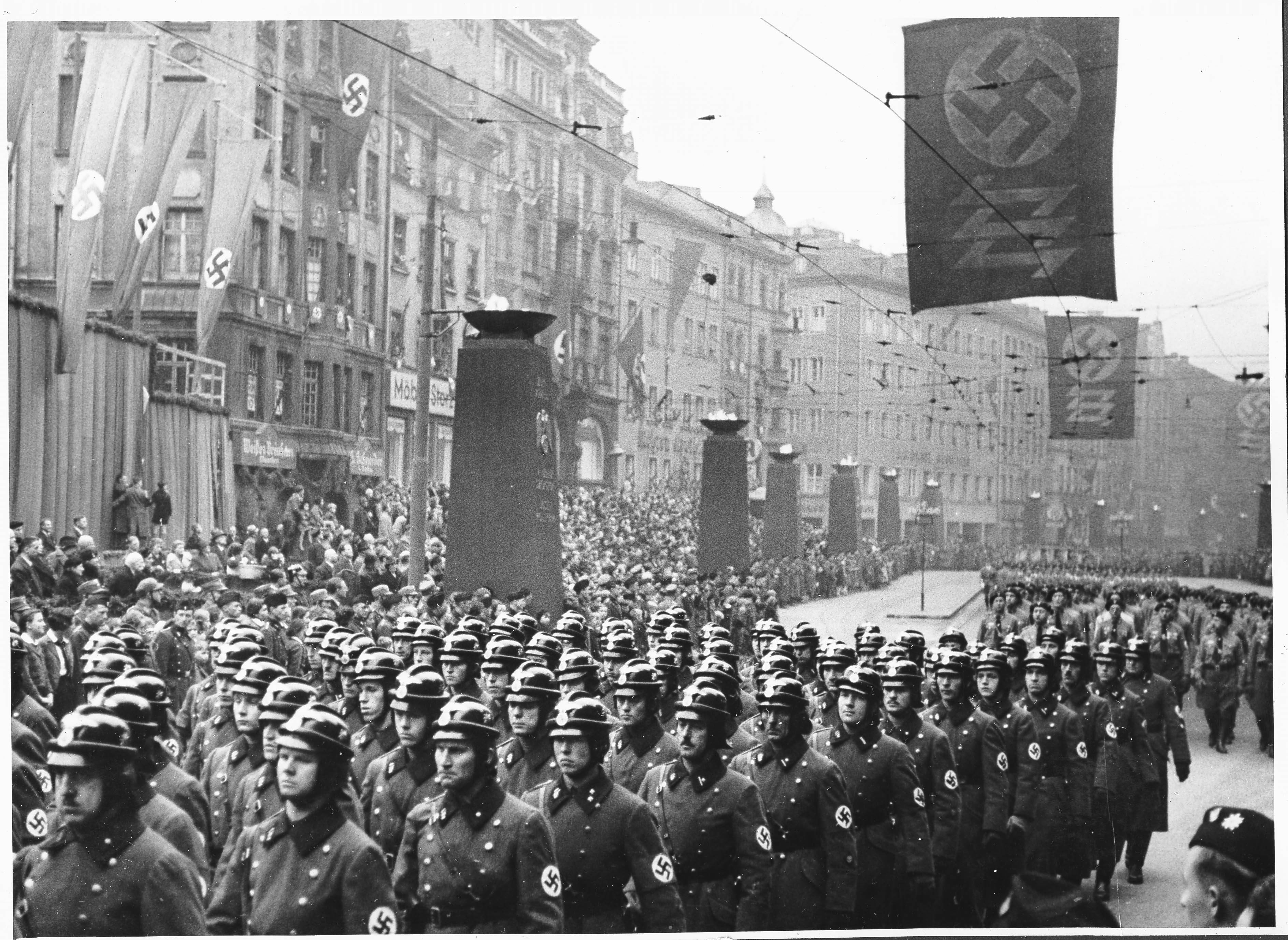 Gedenkfeier am 8./9. November 1938, NSKK-Marschkolonne im Tal in München. (Bayerische Staatsbibliothek, Bildarchiv, hoff-39001)