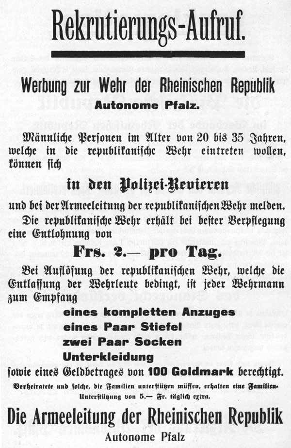 Aufruf der separatistischen Regierung zur Bildung einer Wehrtruppe [aus: Niemals Dokumente aus dem Befreiungskampf der Pfalz, Ludwigshafen 1930,48]