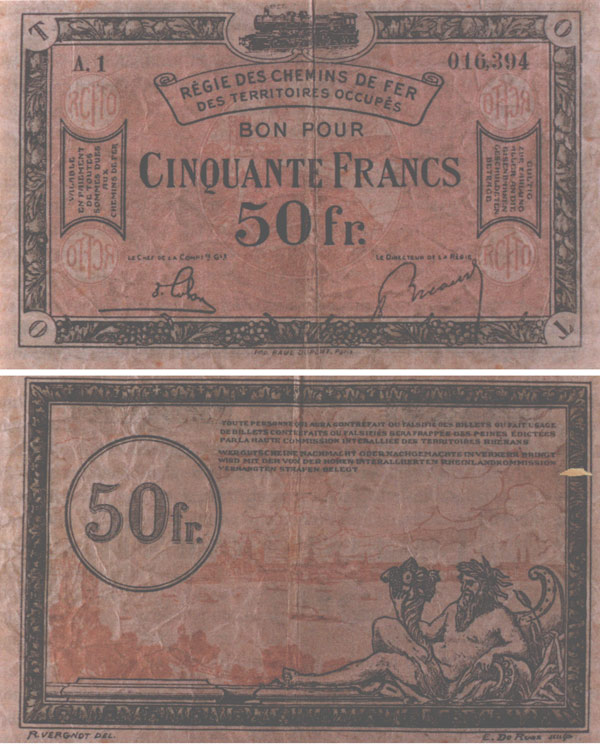 50 Franken der Regiebahn, in der Pfalz in Umlauf gebracht am 25 September 1923 [aus: Gembries, Verwaltung,341]