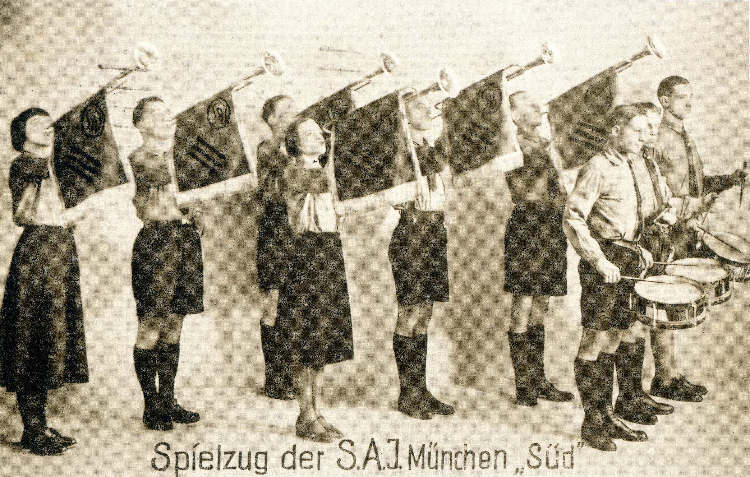 Spielzug der SAJ München-Süd. Auf die Rückseite der Postkarte schrieb Waldemar von Knoeringen (1906-1971) am 5. Februar 1933: "Liebe Genossin Häfner! Der heutige Tag läßt mir die Voraussicht, daß ich morgen noch nicht dienstfähig sein werde. Ich hoffe, von Ihnen Nachricht, ob Sie am Donnerstag um ein Uhr noch Zeit haben, zu erhalten. Mit Freiheit." (Archiv der Münchner Arbeiterbewegung)