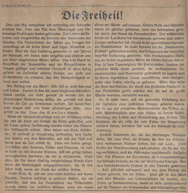 Aufruf "Die Freiheit" aus der Erstausgabe der Zeitung "Süddeutsche Freiheit" vom 18. November 1918, 2.
