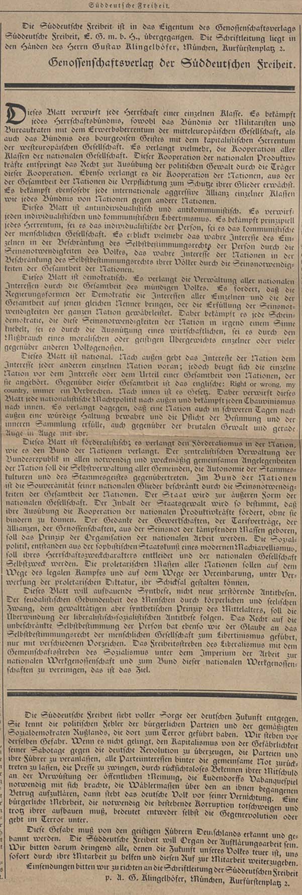 Politische Standortbestimmung der Wochenzeitung "Süddeutsche Freiheit" nach dem Wechsel der Redaktion in der Ausgabe Nr. 6 vom 23. Dezember 1918.