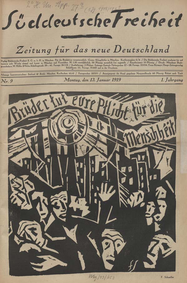 Titelblatt der "Süddeutschen Freiheit", Ausgabe Nr. 9, 13. Januar 1919, mit einer Illustration von Fritz Schaefler "Brüder tut eure Pflicht für die Menschheit".