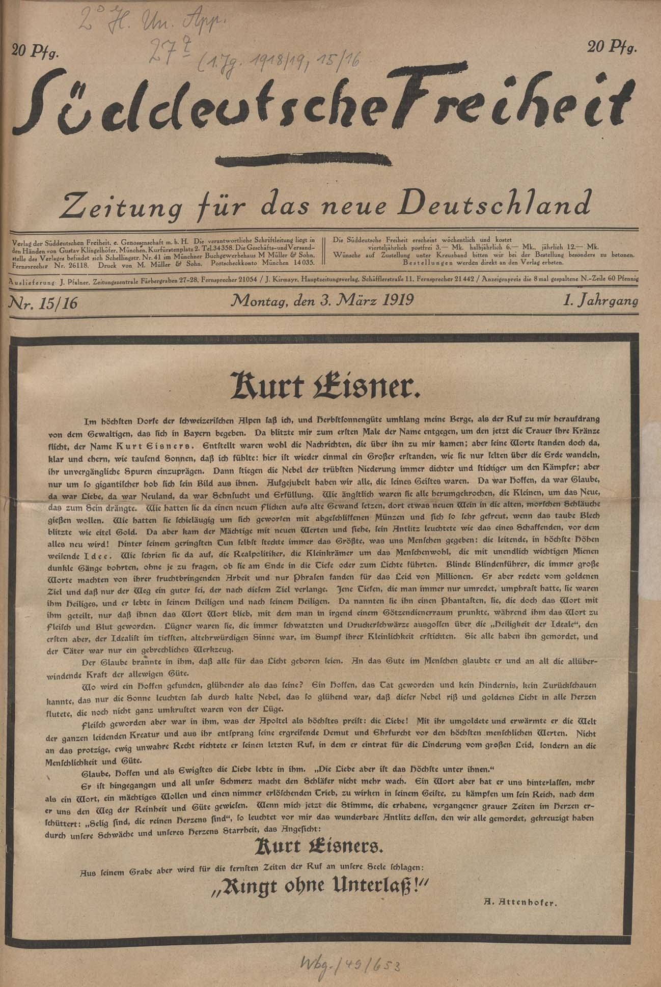 Titelblatt der Zeitung "Süddeutsche Freiheit", Ausgabe Nr. 15/16 vom 3. März 1919 mit einen Nachruf auf Kurt Eisner, verfasst vom Schweizer Schriftsteller, Pädagogen und Philosophen Adolf Attenhofer (1879-1950).