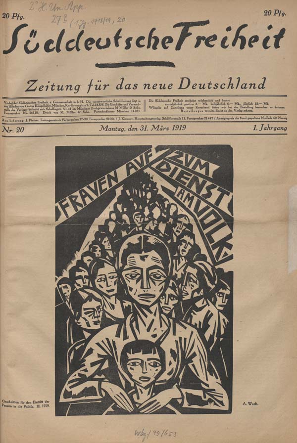 Titelblatt der "Süddeutschen Freiheit", Ausgabe Nr. 20, 31. März 1919, mit einer Illustration von Aloys Wach "Frauen auf zum Dienst am Volk", geschnitten für den Eintritt der Frauen in die Politik".