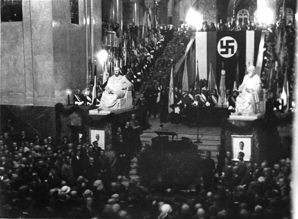 Kundgebung zur Bücherverbrennung in der Ludwig-Maximilians-Universität München am 11. Mai 1933. (Bayerische Staatsbibliothek, Bildarchiv, hoff-7933)
