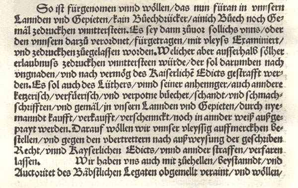 Auszug aus dem zweiten bayerischen Religionsmandat vom 2. Oktober 1524 mit der einschlägigen Bestimmung zum Buchdruck und zur Verbreitung reformatorischer Bücher und Schriften. (Abb. aus: Lanndpot im Hertzogthumb Obern unnd Nydern Bayrn wider die Lüttheranischen Sect, München 1524)