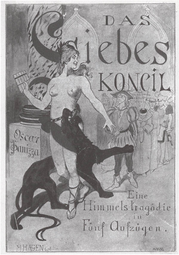 Titelblatt von Oskar Panizza, Das Liebeskonzil. Eine Himmelstragödie in fünf Aufzügen, Zürich 1895. (Bayerische Staatsbibliothek, Rem. [= Remota] II 310)