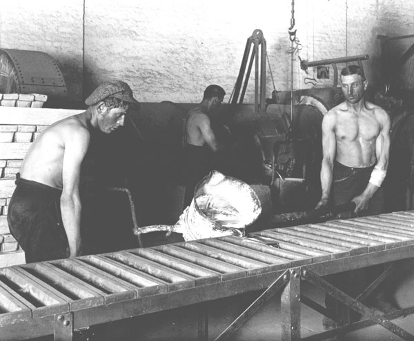 Arbeiter der Aluminiumhütte Töging beim Aluminiumguss in den 1920er Jahren. (Bayerisches Wirtschaftsarchiv)