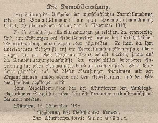 Ernennung des Staatskommissars für Demobilmachung, Martin Segitz, am 12 November 1918 [Bayerische Staatszeitung, 14 November 1918,11]