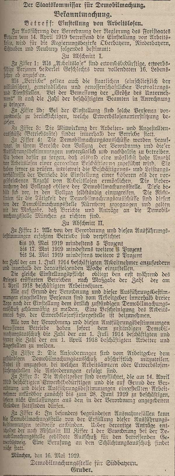 Bekanntmachung des Staatskommissars für Demobilmachung über die Einstellung von Arbeitslosen, 16. Mai 1919. (Bayerische Staatszeitung, 20. Mai 1919, 11)