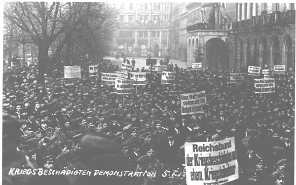 Demonstration von Kriegsbeschädigten vor dem Ministerium für soziale Fürsorge am Münchner Promenadenplatz, 5. Januar 1919. (Bayerische Staatsbibliothek, Bildarchiv, hoff-5157)