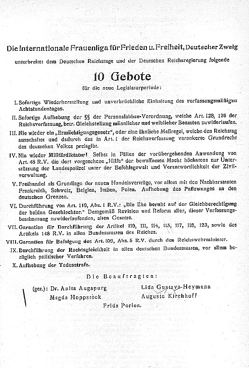 10 Gebote für die Neue Legislaturperiode, Forderungen des deutschen Zweigs der IFFF an den Reichstag, 1925 [aus: Die Frau im Staat, 7 Jg [1925], Heft1,3]