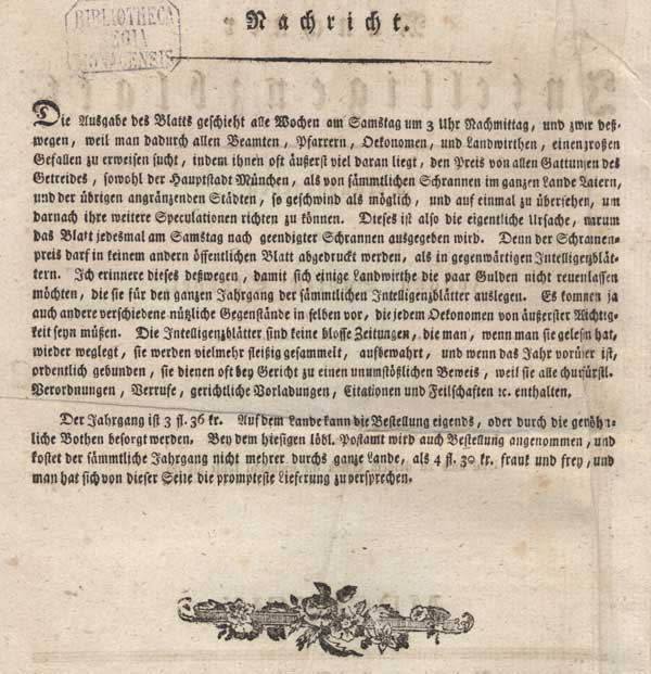 Vorbemerkung über die Erscheinungsweise des Intelligenzblatts. (aus: Münchner Intelligenzblatt 4 [1799], Sp. 3-4, 1. Januar 1799)