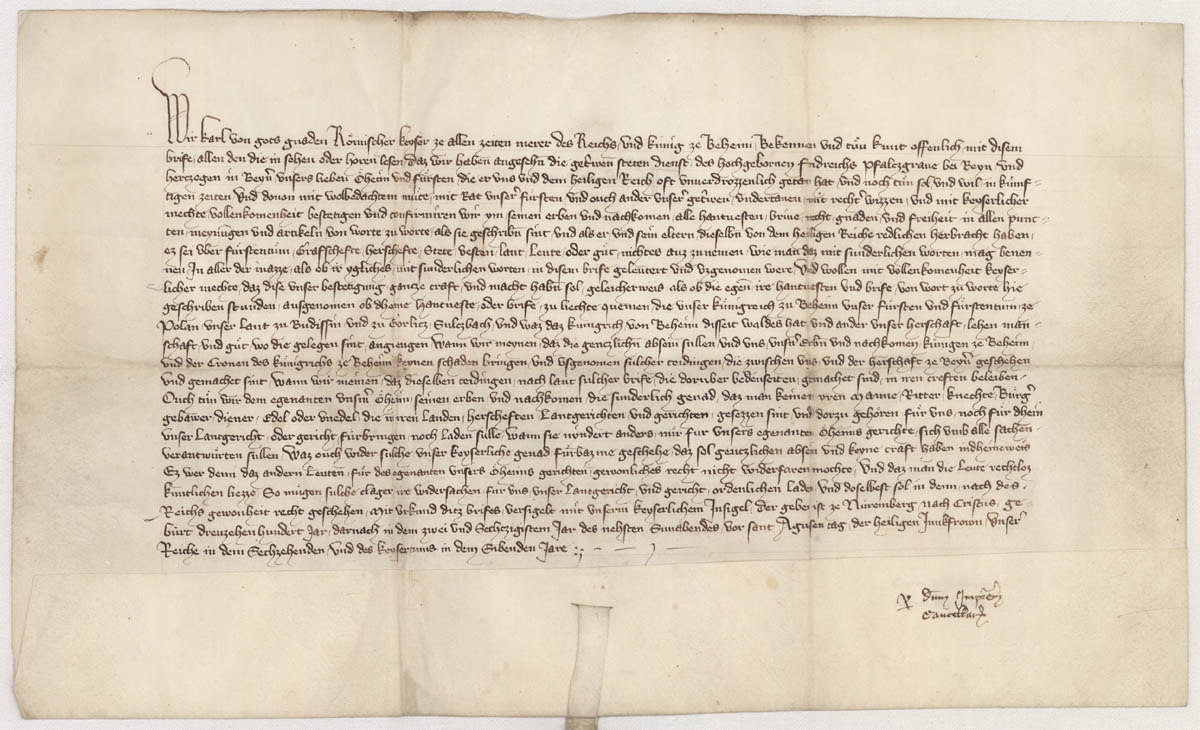 Kaiser Karl IV [reg 1346-1378, Kaiser ab 1355] gesteht dem jungen Herzog Friedrich von Bayern 1362 im Rahmen einer Rechtebestätigung zu, dass niemand aus seinen Landen vor ein kaiserliches Gericht gefordert werden darf [Bayerisches Hauptstaatsarchiv Pfalz-Neuburg, Landesteilungen und Einungen107]